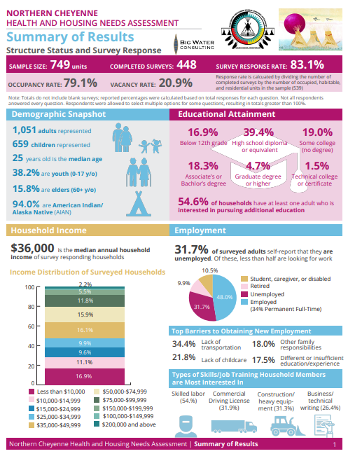 The Northern Cheyenne Health and Housing Needs Assessment project is one in a series of tribal needs assessments funded in part by the Montana Healthcare Foundation focused on the linkage between housing conditions and health outcomes in tribal communities in Montana. The thorough study was carried out to pinpoint the most urgent requirements of individuals living on the Northern Cheyenne Indian Reservation.